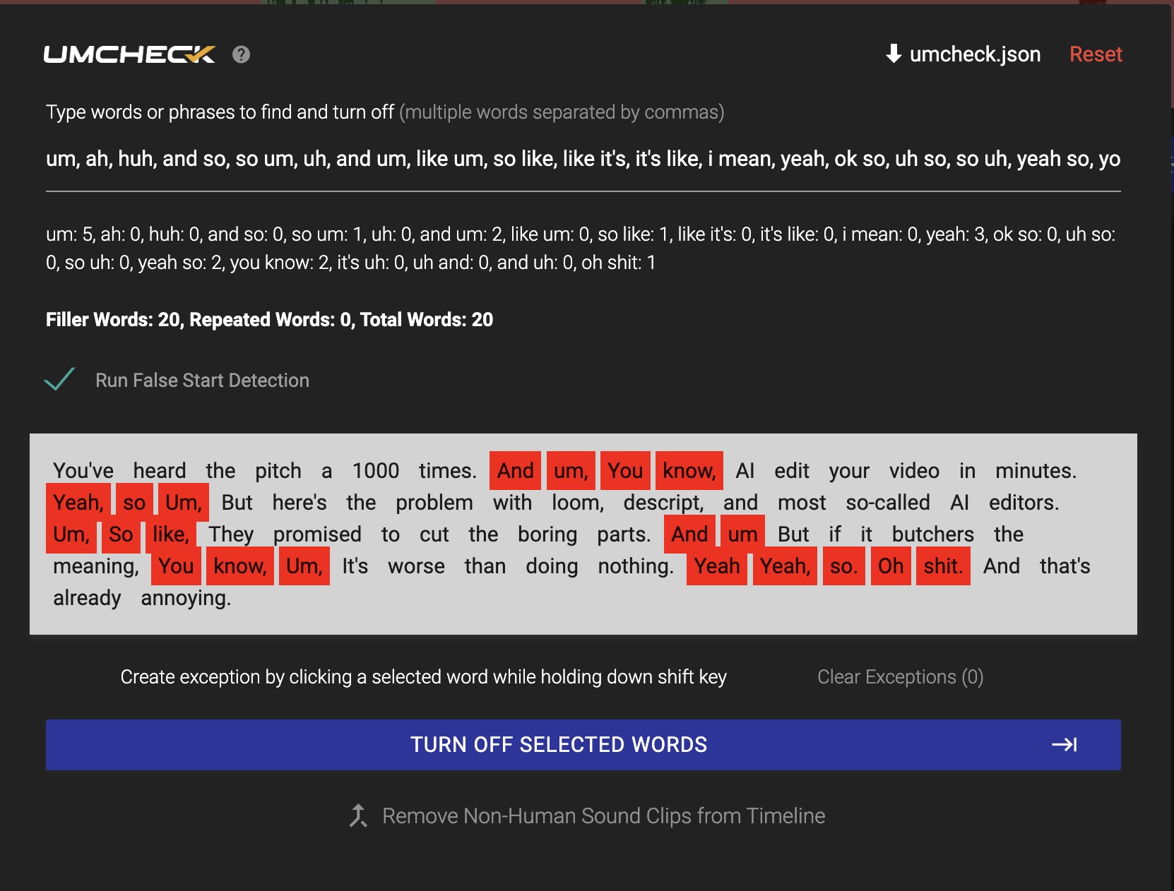 Filler words included common hesitations such as “um,” “yeah,” “so,” “you know,” as well as combinations like “and um” and “oh shit.” These counts were confirmed using Timebolt’s Umcheck analysis tool.